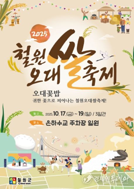 경제인투데이 류현민 기자 | 철원군은 10월 17일부터 19일까지 3일간 철원군 동송읍 장흥리 2721번지 은하수교 주차장 일원에서 『2025 철원오대쌀 축제』를 개최한다.