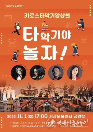 경제인투데이 류현민 기자 | (재)거창문화재단은 오는 11월 1일 토요일 오후 5시 거창문화센터 공연장에서 카로스 타악기 앙상블과 함께하는'타악기야 놀자!'를 개최한다.