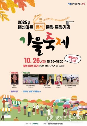 경제인투데이 류현민 기자 | 고양특례시는 오는 26일 오후 3시 30분부터 오후 7시 30분까지 ‘행신아트 음식문화 특화거리 가을축제’를 행신아트거리 일대에서 개최한다고 밝혔다.