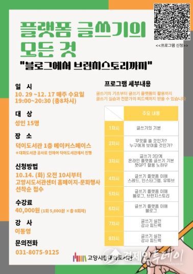 경제인투데이 류현민 기자 | 고양특례시 대화도서관에서는 글쓰기의 기초부터 글쓰기 플랫폼의 활용까지 배워볼 수 있는 독서문화 프로그램‘플랫폼 글쓰기의 모든 것’을 10월 29일부터 운영한다.