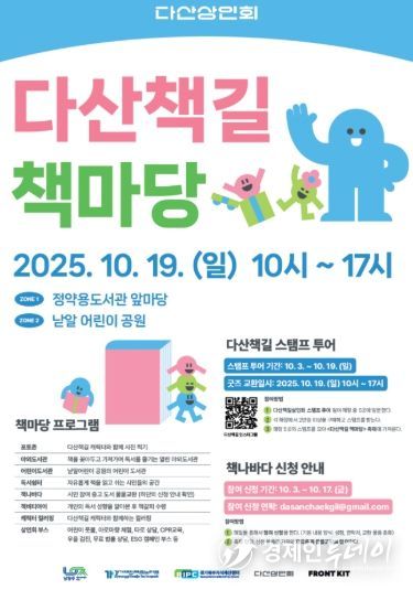 “다산책길 책마당” 행사는 책과 함께 여유를 즐길 수 있는 야외도서관과 독서쉼터가 조성되고, 시민 참여 중고 도서 물물교환 책나바다, 개인의 독서성향을 알아볼 수 있는 책비티아이, 컬러링 아트, 어린이 풋볼, 아로마테라피, 타투 스티커 등 다양한 체험 프로그램이 마련됐으며, 현직 변호사의 무료 법률상담과 지식재산(IP) 전문가 상담, ESG 부스도 운영할 예정이다. 또한 에코백, 책갈피, 손수건, 노트, 타투 스티커 등 다산책길 캐릭터 굿즈가 다채로움을 더할 예정이다.