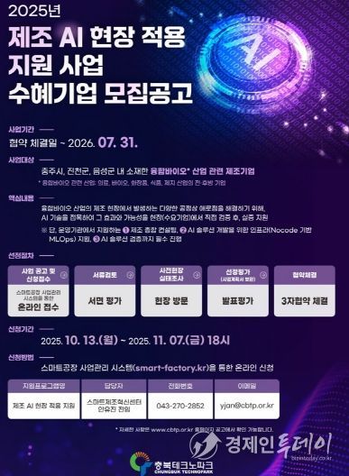 기타 ‘제조 AI 현장 적용 지원사업’에 대한 자세한 사항은 충북도청 홈페이지에서 확인할 수 있다.