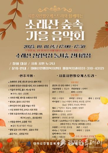 경제인투데이 류현민 기자 | 시흥시 대야ㆍ신천행정복지센터는 오는 10월 18일 소래산 삼림욕장 놀자숲 잔디광장에서 대야ㆍ신천동 지역 주민을 위한 ‘소래산 숲속 가을 음악회’를 개최한다.