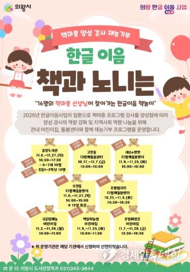 경제인투데이 류현민 기자 | 의왕시는 '한글 이음 사업'의 일환으로 민관학이 협력하는 ‘찾아가는 도서관 책마중 프로그램’을 활발히 추진하고 있다고 밝혔다.