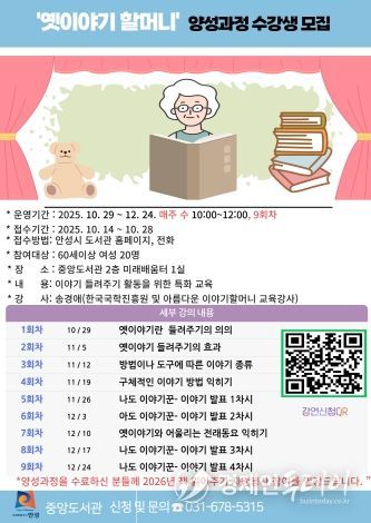 도서관 관계자는 “지역 어르신들이 삶의 지혜와 전통 이야기를 전하며 세대 간 소통의 다리를 놓는 뜻깊은 과정이 될 것이고 본 과정을 수료한 참여자들은 2026년 ‘책 읽어주기’ 자원봉사 프로그램에 참여할 수 있도록 안내할 계획이다.”라고 전했다.
