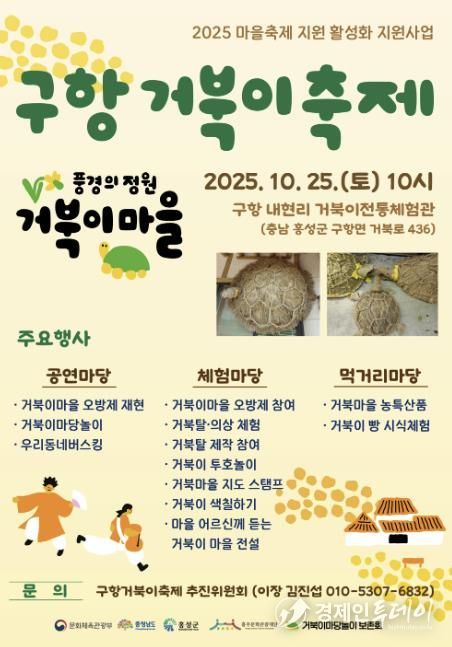 한편, ‘구항 거북이 축제’는 2025년 마을 축제 지원 및 활성화 사업의 일환으로 추진되며, 지역 전통문화를 기반으로 주민이 직접 기획 및 운영하는 생활 속 문화축제로 자리매김하고 있다.