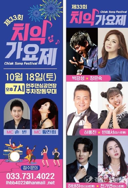 경제인투데이 류현민 기자 | (사)한국연예예술인협회 원주지부가 주관하는 ‘제33회 치악가요제’가 오는 18일 오후 7시, 댄싱공연장 주차장 상설공연장에서 화려하게 막을 올린다.