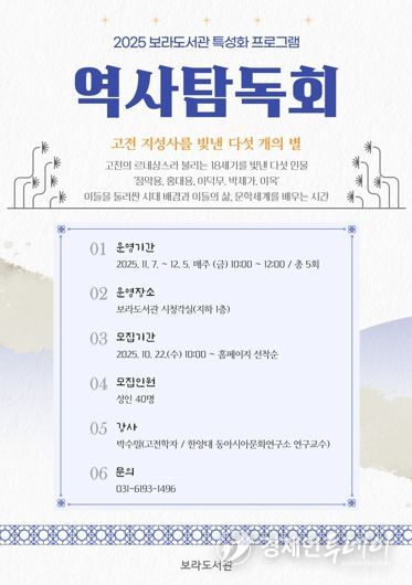 경제인투데이 류현민 기자 | 용인특례시 보라도서관은 오는 11월 7일부터 12월 5일까지 고전 인문학 프로그램으로 ‘2025 역사 탐독회’를 운영한다고 21일 밝혔다.