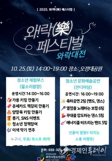 경제인투데이 류현민 기자 | 부천여성청소년재단이 운영하는 부천시청소년센터는 오는 10월 25일 오후 2시, 부천 오정대공원에서 와!락(樂) 페스티벌 ‘와락대전’을 진행한다고 밝혔다.