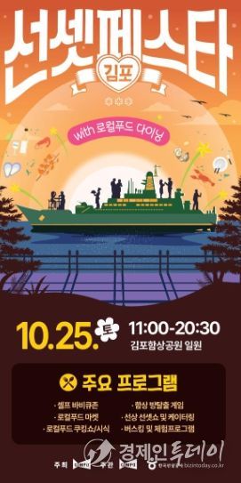 시 관계자는 “김포 선셋 페스타는 함상 석양을 배경으로 로컬푸드 미식과 문화 콘텐츠가 어우러지는 색다른 축제”라며 “안전하고 쾌적한 환경에서 시민과 관광객 모두에게 잊지 못할 경험을 제공하겠다”고 말했다.