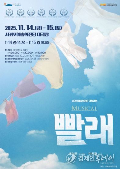 경제인투데이 류현민 기자 | 서귀포예술의전당은 오는 11월 14일 오후 7시 30분, 11월 15일 오후 3시, 이틀간 총 2회에 걸쳐 서귀포예술의전당 대극장에서 뮤지컬‘빨래’를 선보인다.