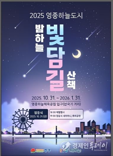 경제인투데이 류현민 기자 | (재)인천중구문화재단(이사장 김정헌)은 올해 10월 31일부터 오는 2026년 1월 31일까지 3개월간 야간 경관조명 ‘2025 영종 빛 축제 - 영종하늘도시 밤하늘 빛담길’을 운영한다고 밝혔다.
