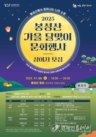 경제인투데이 류현민 기자 | 김포문화재단(대표이사 이계현)은 오는 11월 4일 김포 봉성산 일원에서 '2025 봉성산 가을 달맞이 문화행사'를 개최한다고 밝혔다.