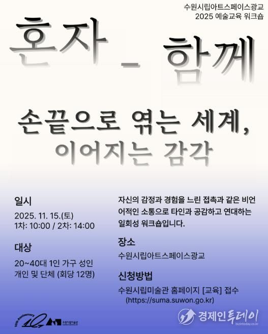 경제인투데이 류현민 기자 | 경기도 수원시립미술관은 예술을 통해 타인과의 관계를 확장하고 감각을 회복하는 예술교육 워크숍 '혼자-함께'를 11월 15일 수원시립아트스페이스광교에서 개최한다.