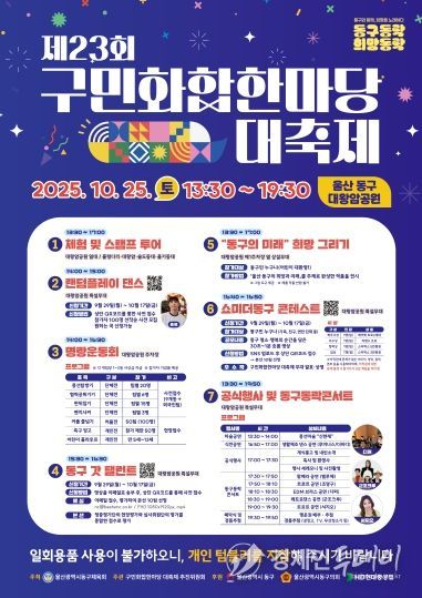 구민화합 대축제는 공연·체험·전시 등 다채로운 프로그램으로 구성돼 있다. 오후 1시 30분부터 마술공연을 시작으로, 젊은 세대가 참여하는 ‘랜덤 플레이 댄스 대회’와 외국인 주민과 함께 어울리는‘명랑운동회’가 이어진다. 이어 3시 30분부터는 지역의 숨은 실력을 발굴하는 ‘동구 갓 탤런트’가 열리며, 5시 개회식 이후에는 인기 가수와 지역 예술단체가 함께 꾸미는‘동구동락 콘서트’ 등 풍성한 무대가 펼쳐진다.