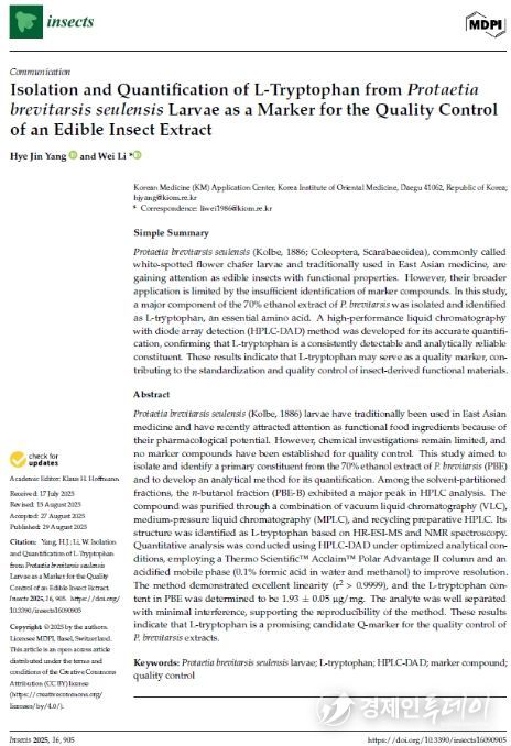 농촌진흥청은 이번 연구로 꽃벵이 추출물의 뼈 건강 개선 지표성분이 L-트립토판임을 밝히고 국제학술지 Insects(IF 2.9)에 논문으로 게재했다. 이로써 꽃벵이를 활용한 기능성 소재 표준화와 품질관리 체계 확립의 과학적 근거를 마련했다.