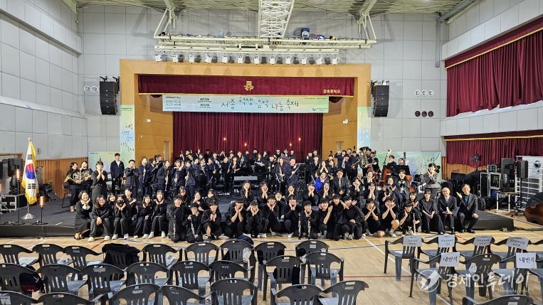 경제인투데이 류현민 기자 | 세종특별자치시교육청은 11월 4일에 금호중학교 다목적강당에서 금호중학교(교장 강승연, 이하 금호중)의 ‘금호윈드오케스트라’(지도교사 조현영, 지휘자 연춘흠)와 연서중학교(교장 유효종)의 ‘연서오케스트라’(지도교사 이은정, 지휘자 김채연)가 함께 만드는 ‘2025 세종예술온(ON)학교’ 예술학교 ‘세종 학생 음악 나눔 축제’를 성황리에 마쳤다.