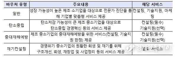 기업의 특성과 필요에 따라 4가지 유형(①일반, ②탄소중립, ③중대재해예방, ④재기컨설팅)으로 구분하며, 유형별로 기업 특성에 맞춘 3개 서비스(컨설팅·기술지원·마케팅)를 바우처 방식으로 지원할 예정이다.