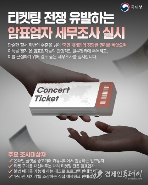 경제인투데이 류현민 기자 | 단순한 질서 위반의 수준을 넘어 '국민 개개인의 정당한 권리를 빼앗으며' 이득을 챙겨 온 암표업자들의 관행적인 탈루행위에 주목하고, 이를 근절하기 위해 강도 높은 세무조사를 실시합니다.