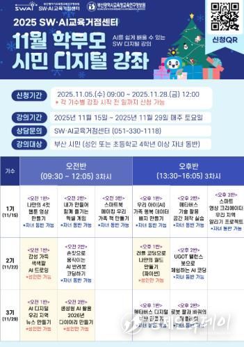 경제인투데이 류현민 기자 | 부산광역시교육청교육연구정보원은 오는 15일부터 29일까지 매주 토요일마다 북구 덕천동 소재 SW·AI교육거점센터에서 시민 200여 명을 대상으로 ‘시민 디지털 강좌’를 운영한다.