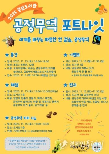 경제인투데이 류현민 기자 | 성남도시개발공사 중원도서관은 오는 11월 15일부터 11월 30일까지 ‘2025 공정무역 포트나잇(Fair Trade Fortnight)’ 행사를 운영한다고 13일 밝혔다.