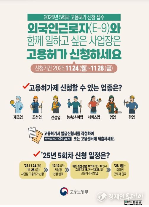 경제인투데이 류현민 기자 | 고용노동부는 11월 24일부터 11월 28일까지 전국 지방고용노동관서를 통해 외국인근로자(E-9)에 대한 올해 5회차 신규 고용허가 신청을 받는다.