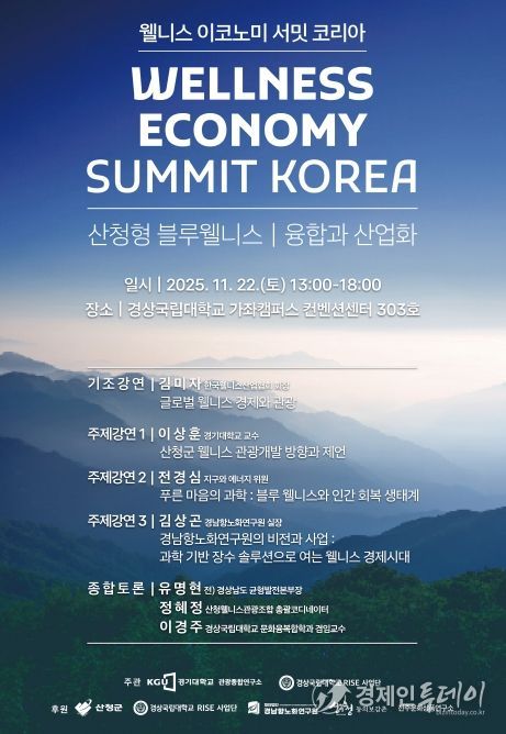 경제인투데이 류현민 기자 | 경상국립대학교 RISE 사업단(지역연계·산청군 과제)과 경기대학교 관광종합연구소는 산청군의 웰니스 관광 발전을 위한 업무협약(MOU)을 체결하고, 그 후속 성과를 공유하고 실행 과제를 구체화할 ‘웰니스 이코노미 서밋 코리아(Wellness Economy Summit Korea)’를 11월 22일 오후 1시 가좌캠퍼스 GNU컨벤션센터 303호에서 연다.