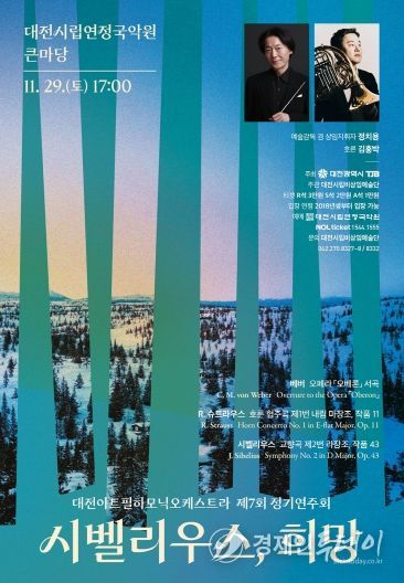 연주회의 대미를 장식할 시벨리우스‘교향곡 제2번’은 넓게 펼쳐진 선율과 북유럽 특유의 서정성, 그리고 마지막 악장에서 폭발하는 승화의 정서가 압도적인 감동을 선사한다. 정치용 지휘자의 견고한 해석과 대전아트필의 응집력 있는 사운드는 이 교향곡이 지닌 장대한 스케일을 설득력 있게 전달할 것이다.