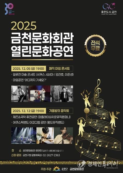 경제인투데이 류현민 기자 | 금천구는 오는 12월 5일과 12월 12일 오후 7시, 두 차례에 걸쳐 금천문화회관에서 기획공연 ‘2025 금천문화회관 열린문화공연’을 개최한다고 밝혔다.
