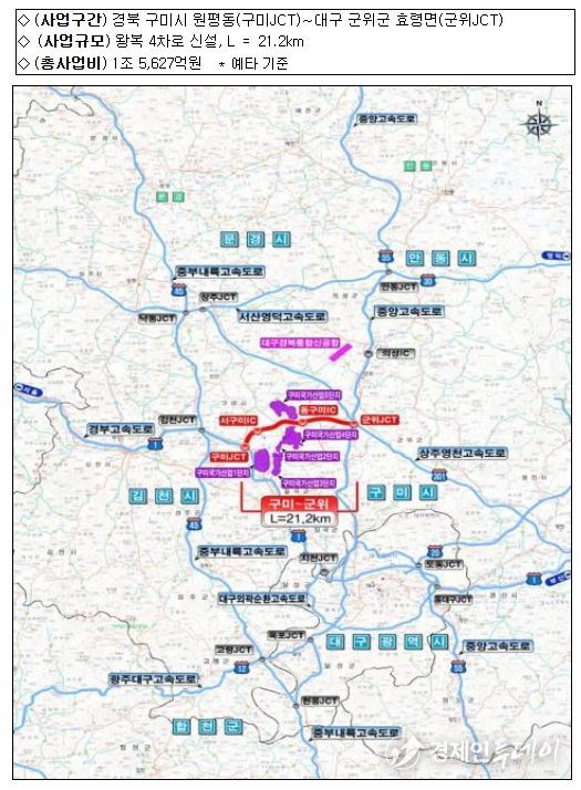 구미-군위 고속도로 건설사업은 경북 구미시에서 대구시 군위군을 잇는 왕복 4차로 고속도로를 건설하는 사업으로,국토교통부는 대구·경북 통합신공항 이전에 따른 교통수요 대응과 구미 국가산업단지 물류 수송 지원을 위해 제2차 고속도로 건설계획(’21~’25)에 해당 노선을 반영(’22.1)한 바 있다.