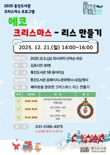 ‘에코 크리스마스 리스만들기’는 12월 21일 오후 2시부터 연령대별로 총 3회차로 나뉘어 통진도서관 1층 문화교실에서 진행되며, 참여 신청은 12월 5일 오전 10시부터 통진도서관 홈페이지 문화행사 신청(모집/행사)페이지에서 김포시민 30명을 선착순 모집한다.