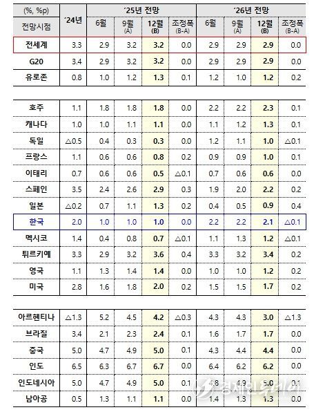 향후 세계경제 성장률은 ’25년 3.2%, ’26년 2.9%, ’27년 3.1% 수준으로 전망된다. 지역별로 살펴보면, 미국은 고용 부진과 관세 인상에 따른 물가 전가 등의 영향으로 ’26년 성장세가 둔화(’25년2.0→’26년1.7→’27년1.9%)될 전망이다. 일본은 금년 내수를 바탕으로 견조한 성장을 기록하겠으나 순수출이 하방요인으로 작용하며 성장세가 둔화(’25년1.3→’26년0.9→’27년0.9%)될 것으로 예상된다. 유로 지역은 ’26년 소폭 둔화된 이후 내수 회복과 무역 반등에 힘입어 ’27년 회복(’25년1.3→’26년1.2→’27년1.4%)할 전망이다. 중국의 경우 부동산 부문의 지속 부진과 조기선적 효과 소멸 등의 영향으로 성장세가 둔화(’25년5.0→’26년4.4→’27년4.3%)될 전망이다.