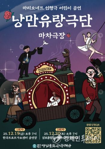 경제인투데이 류현민 기자 | (재)영암문화관광재단은 연말을 맞아 영암군 어린이와 가족을 위한 마리오네트 인형극 어린이 공연 '낭만유랑극단:마차극장'을 오는 12월 19일 오후 7시에 한국트로트가요센터 공연장과 12월 20일(토) 오후 7시에 삼호종합문화체육센터 대회의실에서 개최한다.