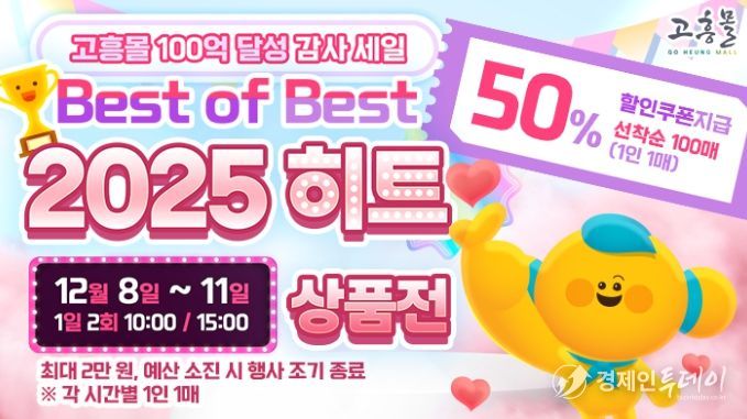 경제인투데이 류현민 기자 | 고흥군은 직영 온라인 농수축특산물 쇼핑몰 ‘고흥몰’이 누적 매출 100억 원 돌파를 기념해 오는 1월 8일부터 11일까지 ‘100억 달성 감사 세일–2025 Best of Best’ 기획전을 진행한다고 밝혔다.