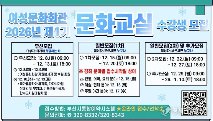 경제인투데이 류현민 기자 | 부산시 여성문화회관은 오는 내일(8일)부터 '2026년 제1기 문화교실' 수강생을 모집한다고 밝혔다.