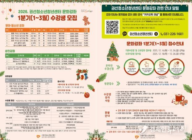 경제인투데이 류현민 기자 | 수원시청소년청년재단 권선청소년청년센터는 오는 1월 6일부터 3월 27일까지 지역사회 평생학습 문화강좌 1분기(1~3월) 수강생을 모집한다.