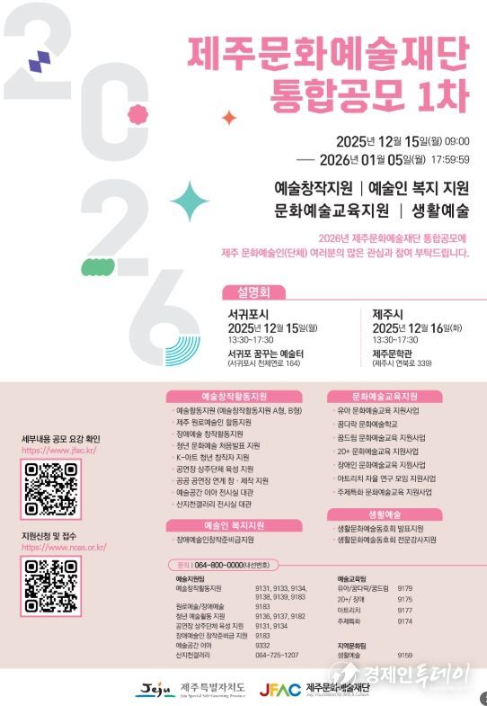 경제인투데이 류현민 기자 | 제주문화예술재단(이사장 김석윤)은 2026년도 지원사업 1차 통합공모를 실시한다. 접수 기간은 2025년 12월 15일부터 2026년 1월 5일까지이며, 문화예술교육 지원사업은 2026년 1월 9일까지 접수한다.