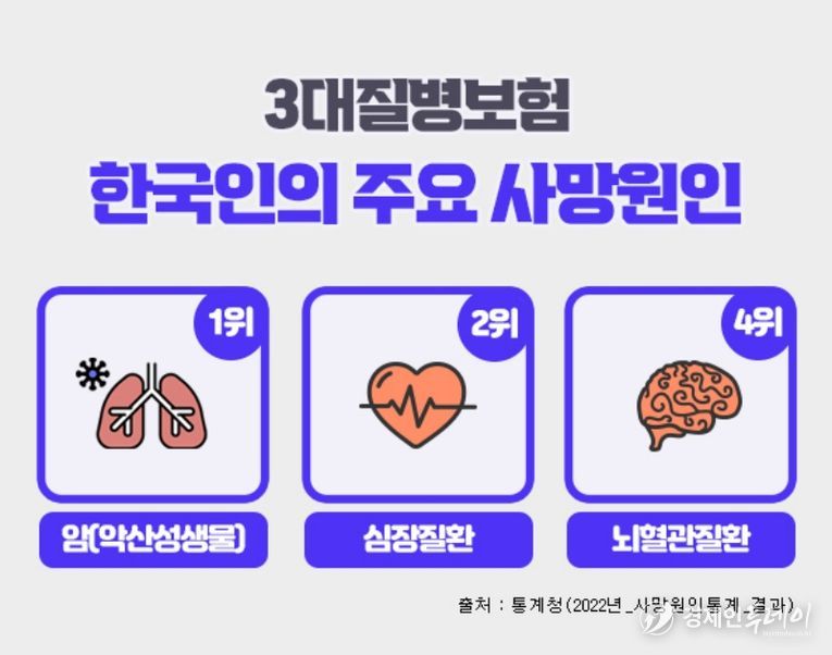 경제인투데이 류현민 기자 | 흔히 3대질병이라 일컫는 암, 심혈관질환, 뇌혈관질환은 통계청 발표자료에 따르면 한국인의 주요 사망원인 중에서 3위 폐렴을 제외하고 1~4위를 차지하고 있으며, 이전부터 지금까지도 살면서 가장 먼저 대비해야 하는 치명적인 질병으로 강조되고 있다. 이러한 중대질병에 대비하기 위하여 상기 세가지 치명적인 질병을 집중보장하는 3대질병진단비보험을 많이 가입하고 있다. 3대진단비보험은 각각의 질병을 중점적으로 보장하면서도 가입자 특성에 맞는 특약을 추가함으로써 종합건강보험으로도 활용할 수가 있다.