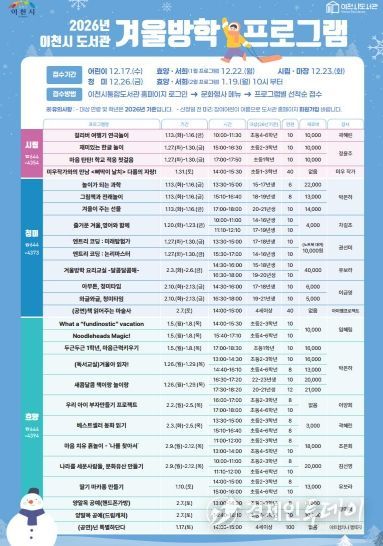 이번 겨울방학 프로그램은 이천시 관내 6개 공공도서관(시립·청미·어린이·효양·마장·서희도서관)에서 진행되며, 독서교실을 비롯해 작가와의 만남, 만들기 체험, 공연 등 다채로운 프로그램을 마련해 방학 기간 어린이들의 독서문화 활동을 지원하고 도서관 이용 활성화를 도모할 예정이다.