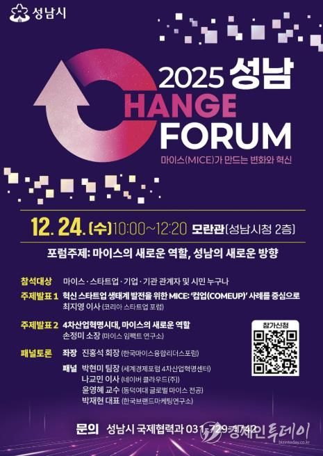 성남시 관계자는 “2025 성남 체인지 포럼은 마이스(MICE)가 산업 간 협력과 생태계 확장을 촉진하며 성남의 변화를 제안하는 첫 행사”라며 “성남의 특화 산업과 도시 전략에 연계한 차별화된 마이스 콘텐츠를 지속적으로 만들어가겠다”고 밝혔다.