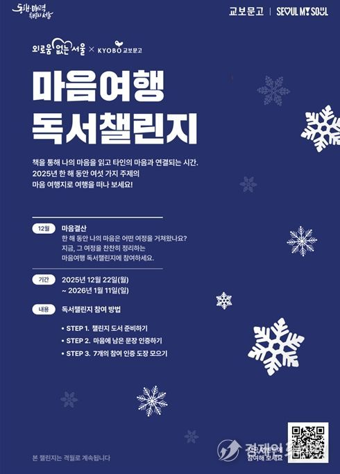 경제인투데이 류현민 기자 | 서울시가 ‘외로움 없는 서울’을 만들기 위한 노력의 일환으로 교보문고와 함께 여섯 번째 ‘마음여행 독서챌린지’를 진행한다. 이번 챌린지는 ‘마음결산’을 주제로, 올해 나의 마음을 움직인 책과 그 속에서 기억에 남는 문장을 선택해 ‘2025 마음결산 리포트’를 완성하며 한 해의 여정을 마무리한다.