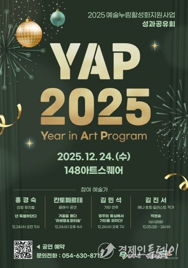 경제인투데이 류현민 기자 | (재)영주문화관광재단은 오는 12월 24일 148아트스퀘어에서 크리스마스 컨셉의 ‘2025 예술누림활성화 지원사업 성과공유회 'YAP 2025'’를 개최할 예정이다.