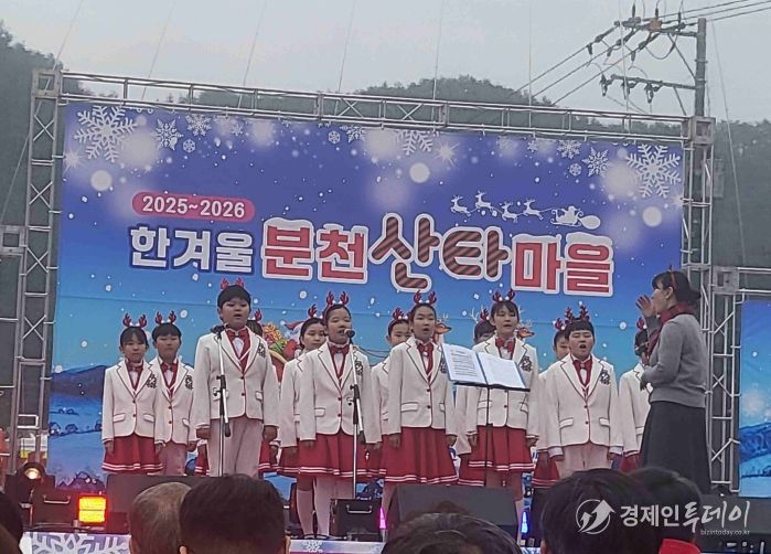 경제인투데이 류현민 기자 | 봉화군 소천면 분천산타마을에서 지난 20일(토) 개최된 ‘2025 한겨울 분천산타마을 개장식’ 이 지역주민과 관광객들의 열띤 호응 속에 성황리에 열렸다. 이번 개장 축하공연에는 봉화교육지원청이 운영하는 봉꽃송이 청소년 합창단이 참여하여 한겨울 추위를 녹이는 따뜻한 무대를 선사했다.