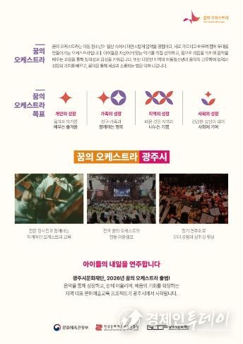 경제인투데이 류현민 기자 | (재)광주시문화재단은 문화체육관광부가 주최하고 한국문화예술교육진흥원이 주관하는 ‘2026 꿈의 오케스트라 운영사업’에서 예비 거점기관 단계를 거쳐 최종 신규 거점기관으로 선정됐다고 22일 밝혔다.