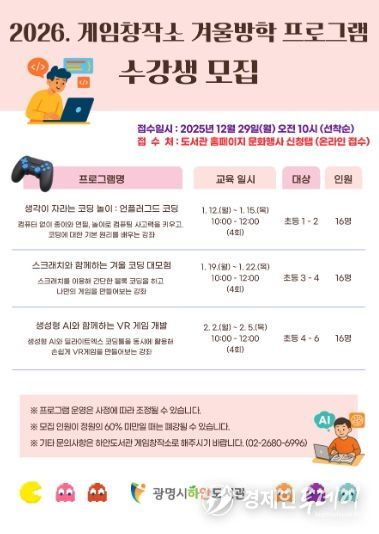 경제인투데이 류현민 기자 | 광명시 게임창작소는 오는 29일 오전 10시부터 겨울방학 프로그램 수강생을 모집한다.