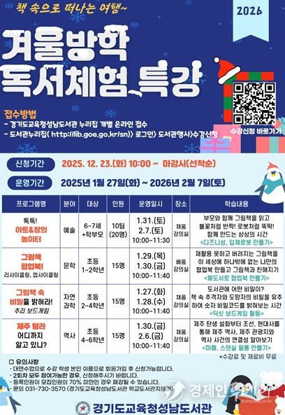 ‘겨울방학 독서교실과 겨울방학 독서체험 특강’의 참가자는 23일부터 경기도교육청성남도서관 누리집을 통해 선착순으로 모집한다.