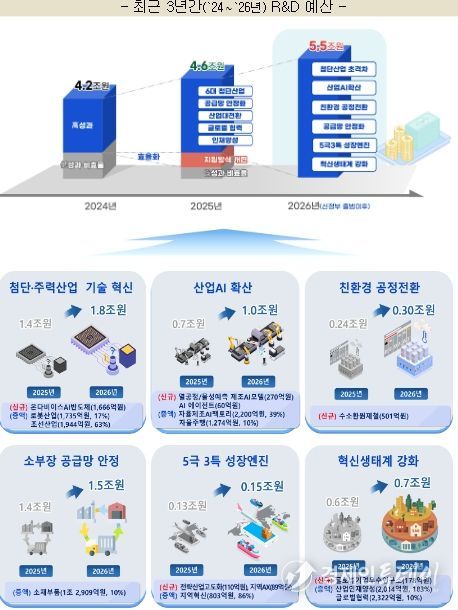 산업부는 ’25년대비 18% 증액된 역대 최대규모인 총 5.5조원을 지원하며, 신규 지원과제는 ’25년대비 85% 증가한 1.4조원을 투자한다. 지원 분야별로는 ▲반도체·이차전지·바이오·미래차·로봇·조선 등 첨단·주력산업 기술혁신에 1조 8,325억원(증액28%), ▲AI팩토리, 피지컬AI 등 산업 AI 확산 기술(M.AX)에 1조 455억원(증액52%), ▲수소환원제철 등 친환경 공정전환 기술에 2,990억원(증액24%), ▲경제안보를 위한 소부장 공급망 안정화에 1조 4,914억원(증액7%), ▲지역전략산업 육성 등 5극3특 성장엔진에 1,528억원(증액14%), ▲우수인재양성, 글로벌 협력 등 혁신생태계 강화에 7,040억원(증액16%)을 지원한다.