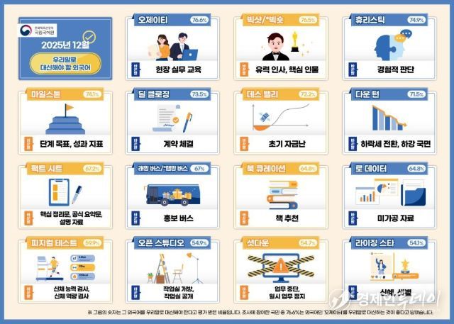 조사 결과 국민이 우리말로 바꾸어 써야 한다고 가장 많이 꼽은 외래 용어는 ‘오제이티’(76.6%)와 ‘빅샷/빅숏’(76.5%), ‘휴리스틱’(74.9%), ‘마일스톤’(74.1%), ‘딜 클로징’(73.5%)이었다. 이에 따라 ‘오제이티’는 ‘현장 실무 교육’으로, ‘빅샷/빅숏’은 ‘유력 인사’ 또는 ‘핵심 인물’로, ‘휴리스틱’은 ‘경험적 판단’으로, 업무 추진 단계에서 기준이 되는 ‘마일스톤’은 ‘단계 목표’ 또는 ‘성과 지표’로, 계약 성사 과정을 뜻하는 ‘딜 클로징’은 ‘계약 체결’로 이해하기 쉽게 다듬었다.