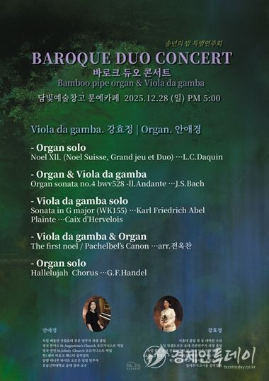 경제인투데이 류현민 기자 | 담양군문화재단은 오는 28일 오후 5시 담빛예술창고 문예카페에서 『2025 담빛예술창고 송년특별연주회 ‘바로크 듀오 콘서트’』를 진행한다고 밝혔다.