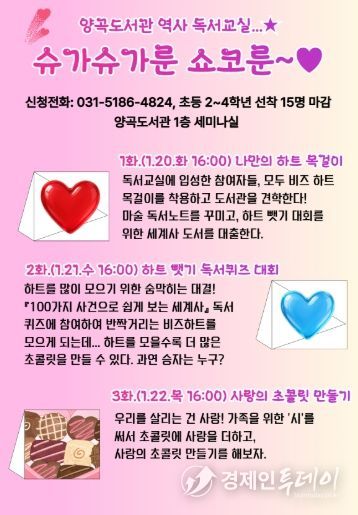 경제인투데이 류현민 기자 | 김포시는 2026년 1월 20일 오후 4시부터 6시까지 1층 세미나실에서 초등학교 2~4학년을 대상으로 한 역사 독서교실 '슈가슈가룬 쇼코룬'을 운영한다.
